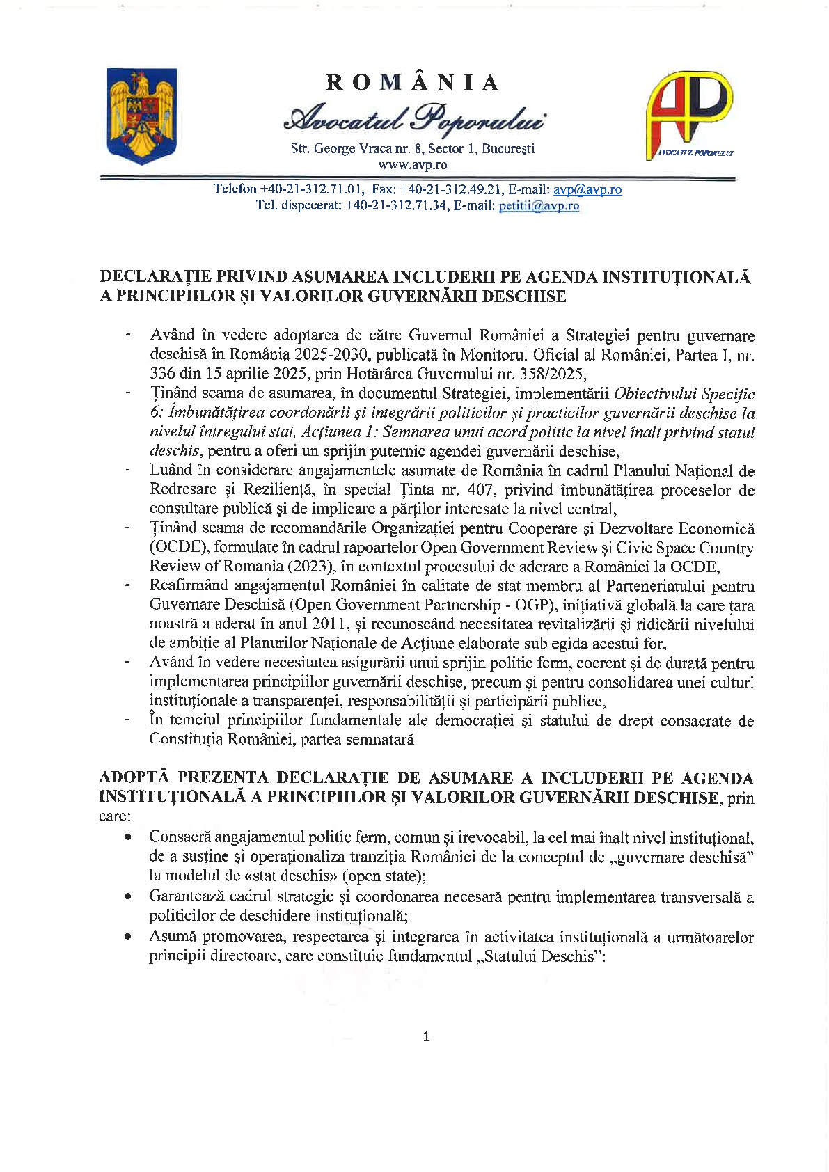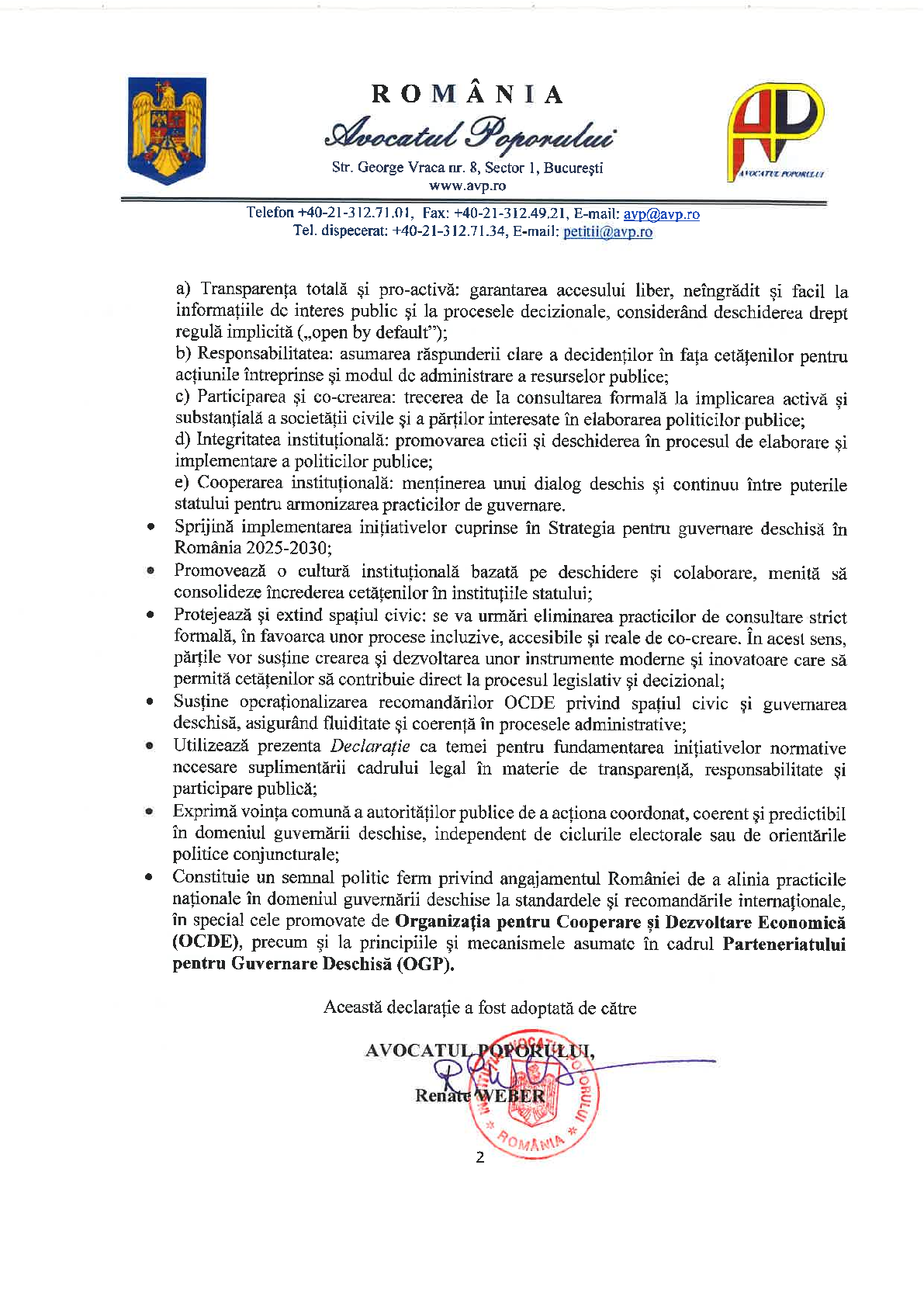 Declarație Avocatul Poporului privind asumarea includerii pe agenda instituțională a principiilor și valorilor Guvernării Deschise